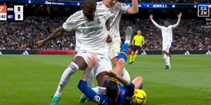 社交媒体上疯传的视频还原了事发瞬间:比赛第26分钟,赫塔菲球员里科在与居勒尔争抢后倒地。此时并未参与对抗的吕迪格突然冲入画面,不仅顺势夸张倒地,更将膝盖重重地压在里科的脸部。这一动作导致里科痛苦翻滚,然而令人咋舌的是,当值主裁与VAR团队竟双双选择“视而不见”,未做任何判罚。西班牙《阿斯报》忍不住发声:“视频裁判组的沉默简直令人费解。”
